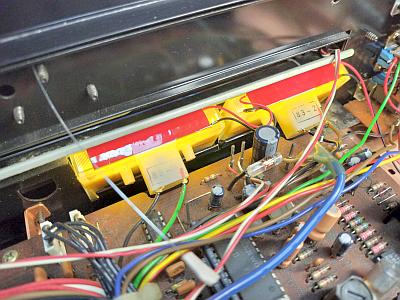 左の写真はメータ取り付けの上側で、右の写真は基板裏に取り付けた電流制限抵抗 680Ω の取り付け状態です。