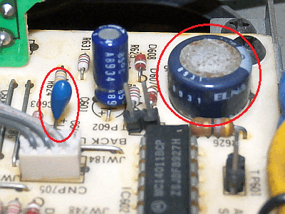 左の写真の小さな赤〇で囲んだ [C603] 10uF/6.3V タンタル → 10uF/25V 積層セラミックコンデンサに交換しました。