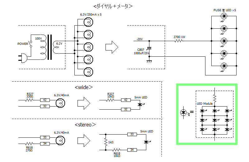 [ダイヤル+メータ] のランプは AC 駆動でしたが、LED は DC 駆動する必要があります。