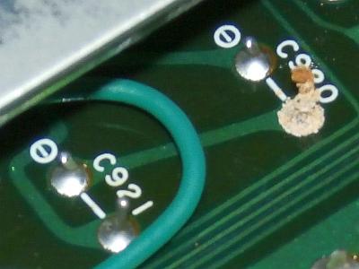 基板の裏側を観察すると、[C920] から液漏れして+側端子にサビが出ていました。