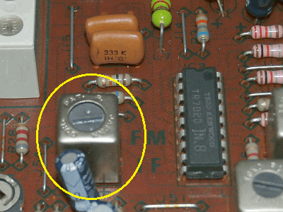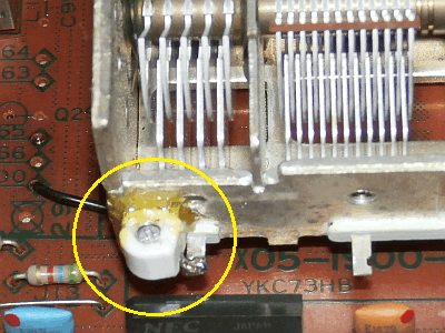 左の写真で黄〇で囲んだ部品が FM OSC 発振用トリマコンデンサです。