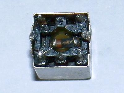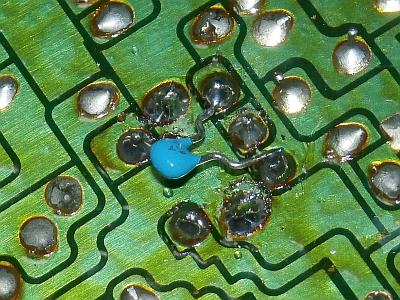 右の写真のように、劣化したチタコンの代わりに 30ppm 温度補償積層セラミックコンデンサ 82pF を基板の裏側に取り付けました。
