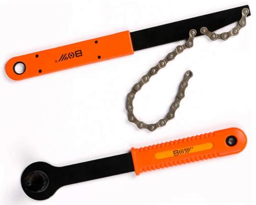 写真でチェーンの切れ端が付いているのが [スプロケットリムーバ] で、その下が [フリーホイールリムーバ] と [リムーバレンチ] です。