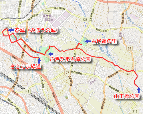 忍城は映画 のぼうの城 のロケで使われ、急に有名になりました。 越谷から山王橋公園までは 緑のヘルシーロード(北)→利根大堰 ルートで行き、さきたま緑道からは さきたま古墳公園→さきたま緑道→掛樋史跡公園 ルートで帰ります。 |