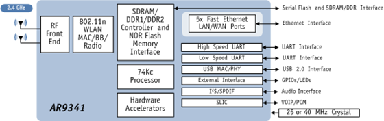 AR9341 supports 64MB of DDR1/DDR2 memory, support for SPI Flash. AR9341 integrates a high-performance MAC / baseband / RF, supports 2.4GHz 2 × 2 MIMO, providing up to 300Mbps wireless bandwidth. AR9341 integrates a 5-port 10/100Mbps Ethernet switch, while ensuring the performance, further enhance the product's reliability and stability. AR9341 internal functional block diagram ![]() |