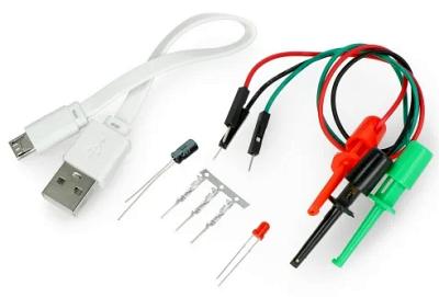 [microUSB 充電ケーブル] [クリップケーブル] [校正ショートピン]、計測テスト用のサンプル [電解コンデンサ] [LED] が付属していました。